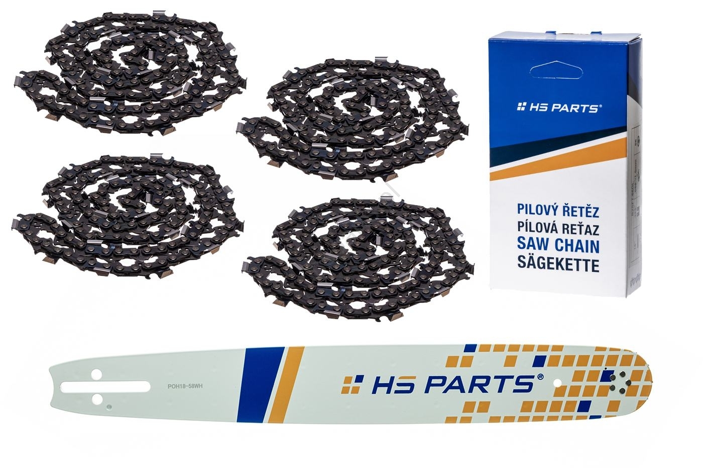 HS PARTS Prowadnica 18" (45 cm) .325" .058" (1,5 mm) + 4 x Łańcuch tnący 72 ogniwa Zęby kwadratowe do Husqvarna 36 45 55 136 254 262 345 346 357 435 445 460 Jonsered 2054 2152 2155 Dolmar 109 111 112 116 Oleomac 938 946 947 952 962 Solo 639 651 665