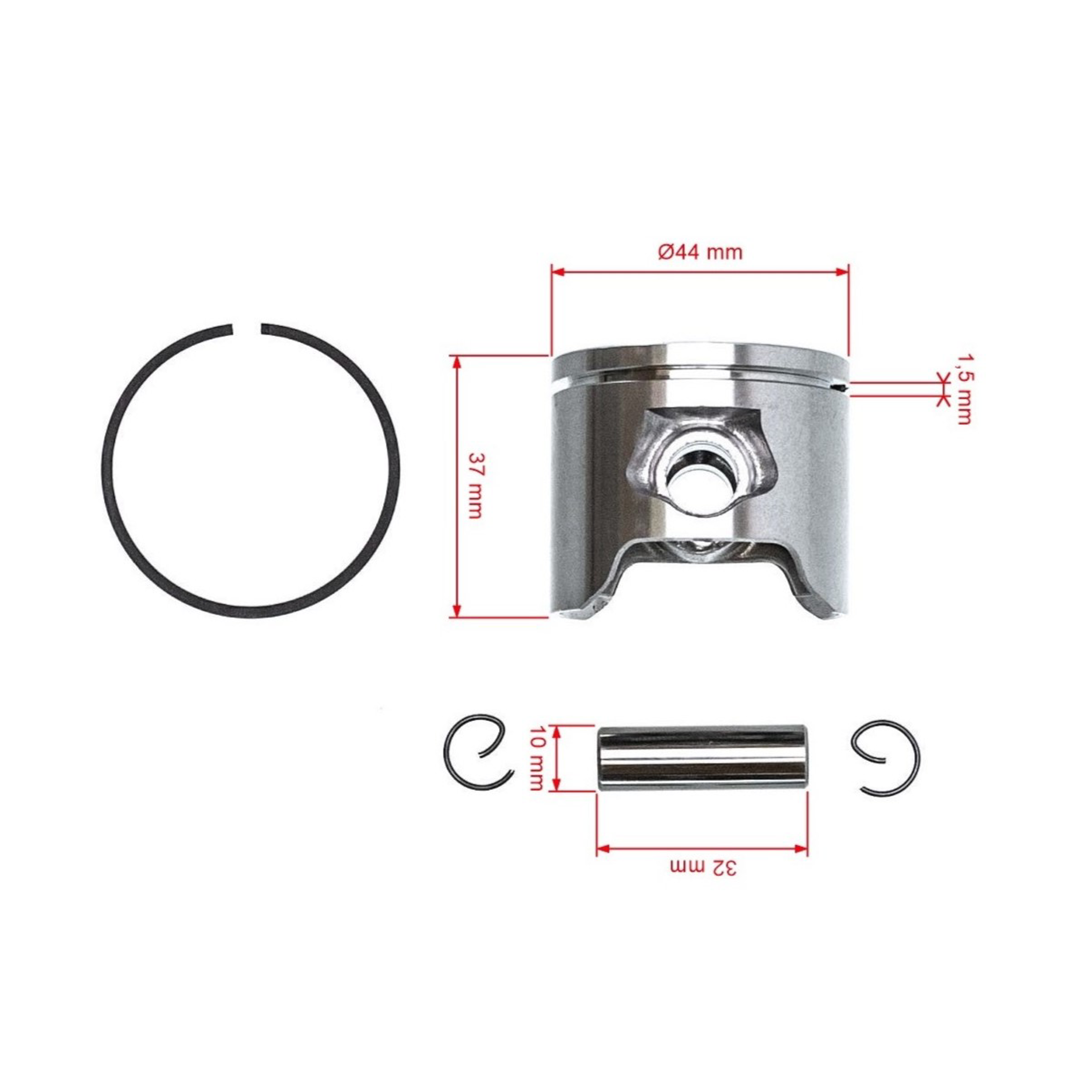 Zawartość opakowania: 1x tłok, 1x sworzeń, 2x pierścień tłokowy, 2x zawleczka