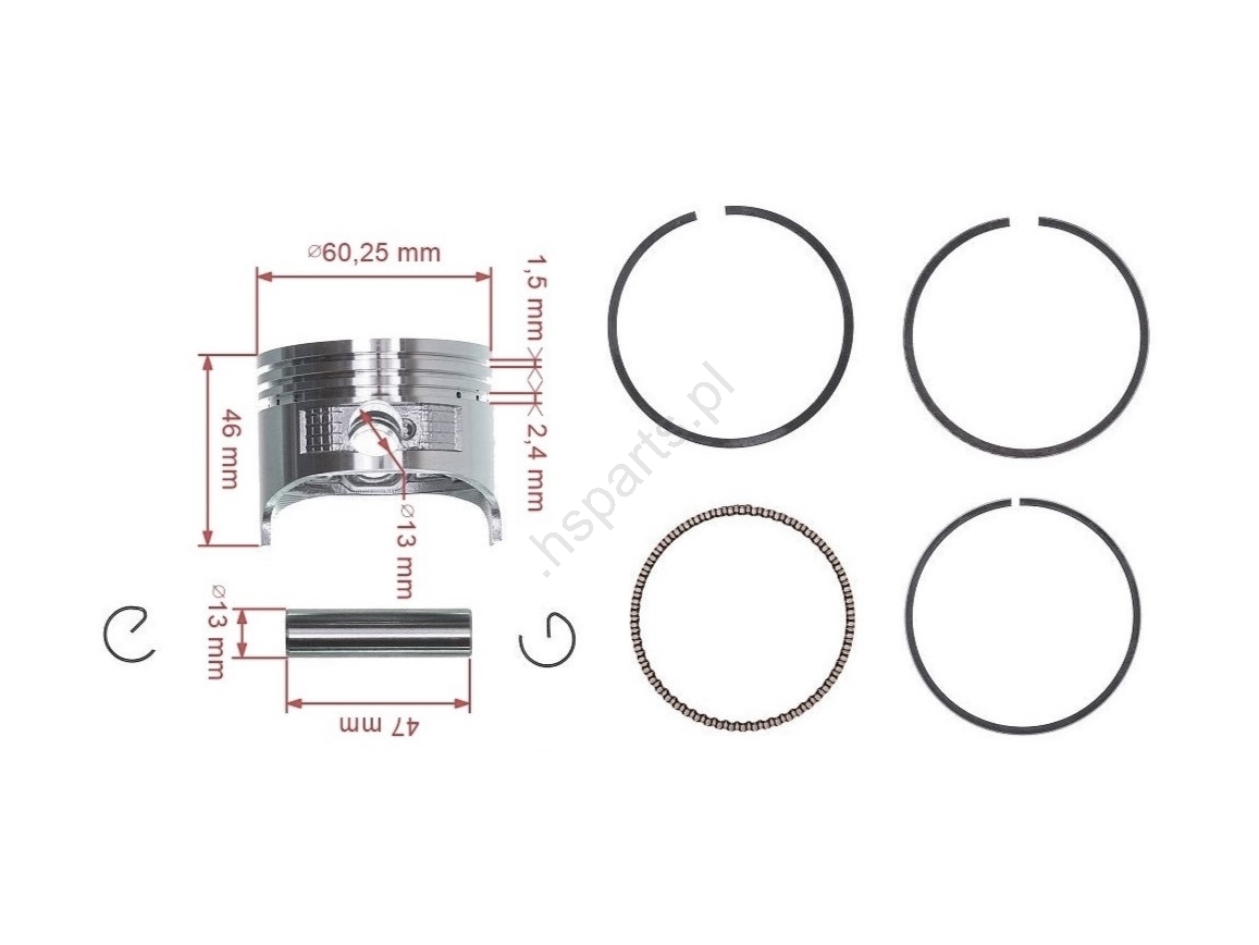 Zawartość opakowania: 1x tłok, 1x sworzeń, 2x zawleczka, 4x pierścień tłokowy