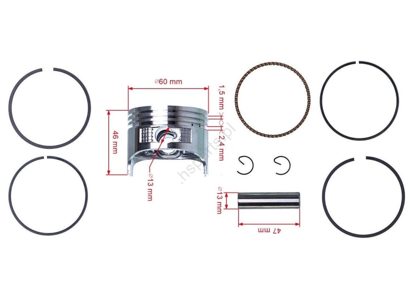 Zawartość opakowania: 1x tłok, 2x zawleczka, 1x sworzeń, 5x pierścień tłokowy