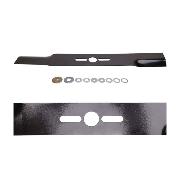 Opis i specyfikacja produktu: Oregon Uniwersalny nóż do cięcia prostego do kosiarek AL-KO Husqvarna John Deere 18" z pierścieniem redukcyjnym