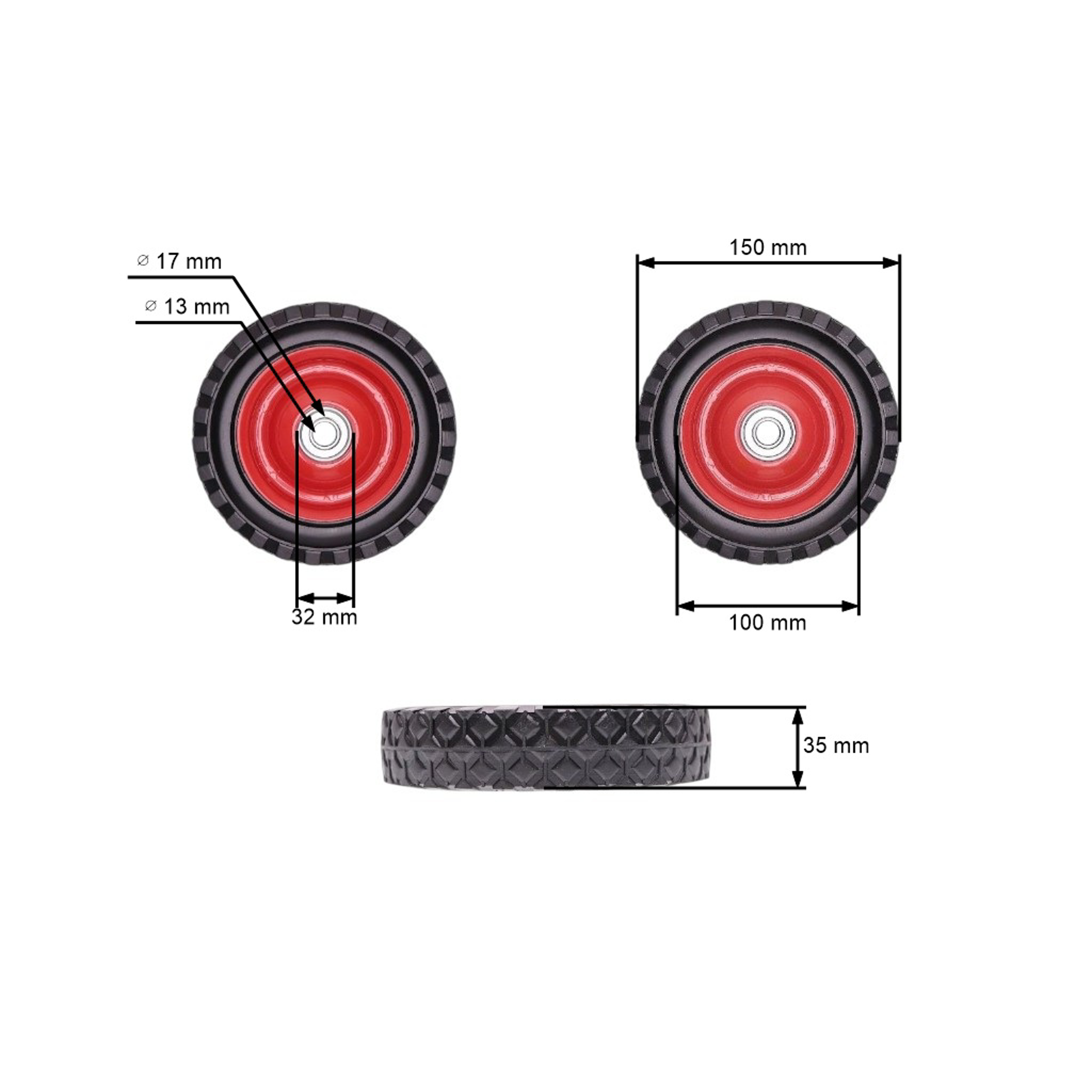 Opis i specyfikacja produktu: Uniwersalne koło stalowe z łożyskiem do kosiarek silnikowych i elektrycznych o średnicy 150 mm z gumową oponą