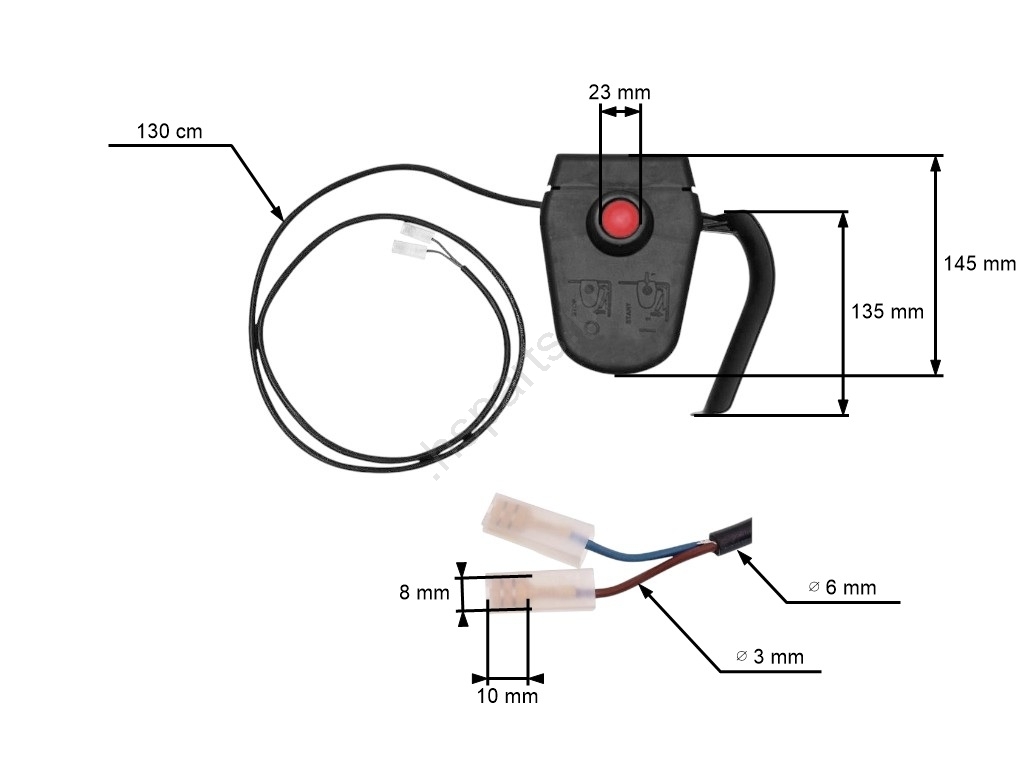 Opis i specyfikacja produktu: Uniwersalny włącznik do kosiarek elektrycznych i wertykulatorów (kabel 130 cm)